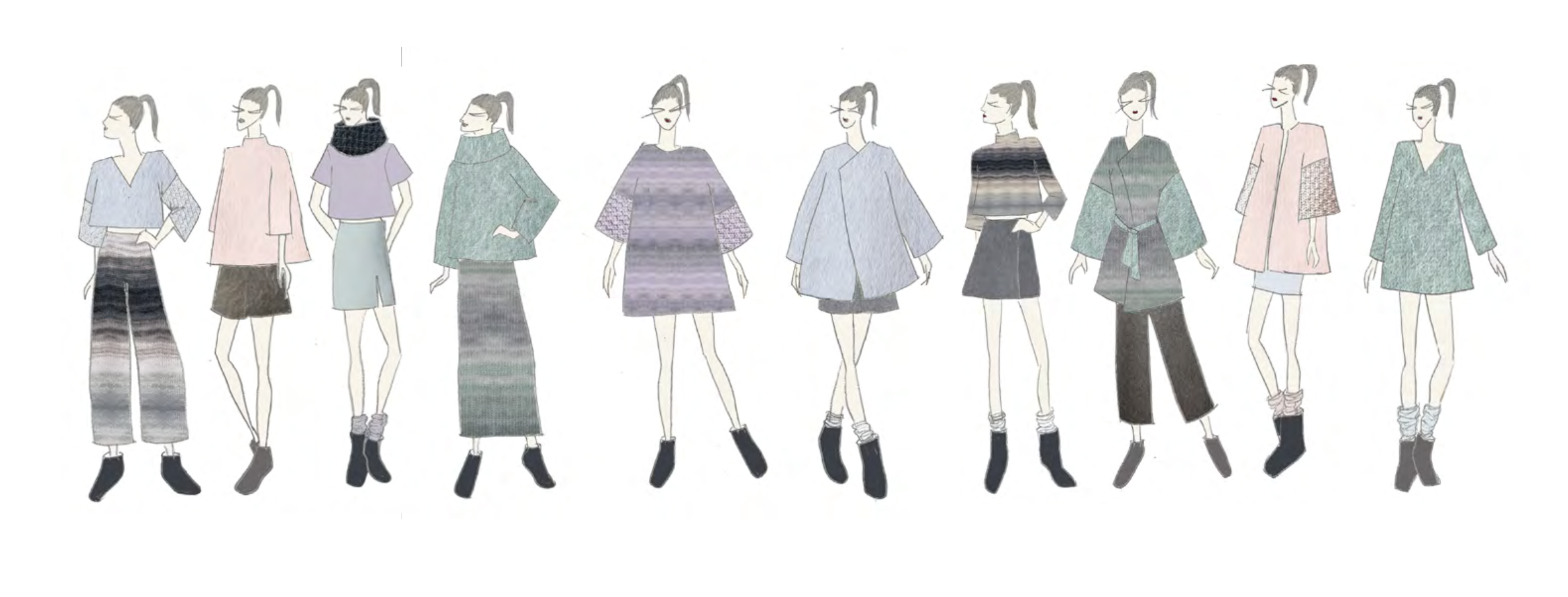 The results are weathered textures and blocks of different knits in structured silhouettes and straight patterns; the colors are soft and cold and fibers used are spongy and low torque.
