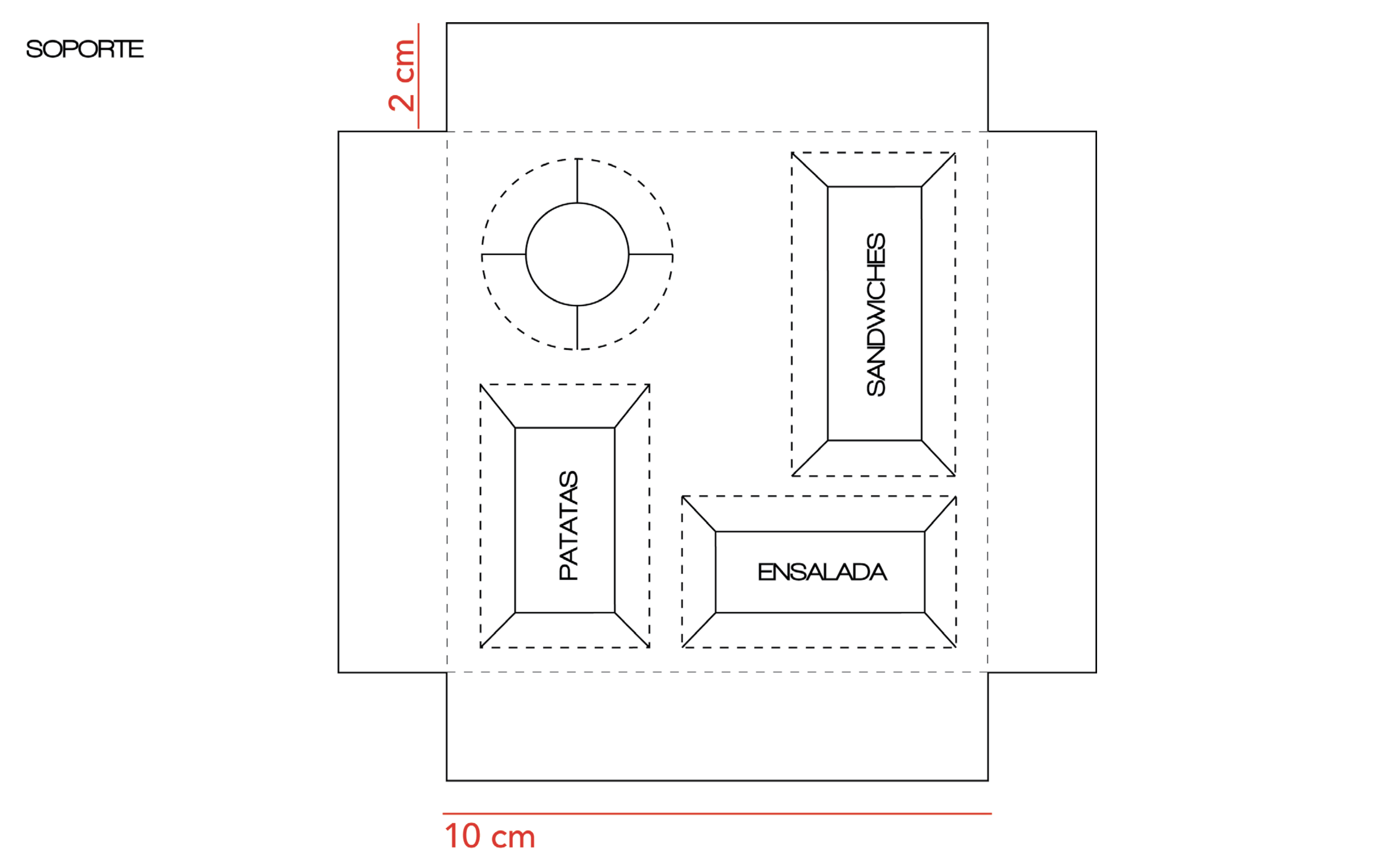 We have created a general pack that allows a series of use options that bring added value to the customer. It is possible to open the menu comfortably, without disassembling the whole, so that the user can eat while walking, driving or performing activities that prevent them from sitting down to eat on a table. If the consumer has that time, he has the option to deploy the packaging to make it a tablecloth and thus to eat comfortably without worrying about staining the surface on which he places his food.The graphical application of the menu will be the same for all the menu types, always in black and white, and will carry a differentiating sticker that will indicate its category through the color.