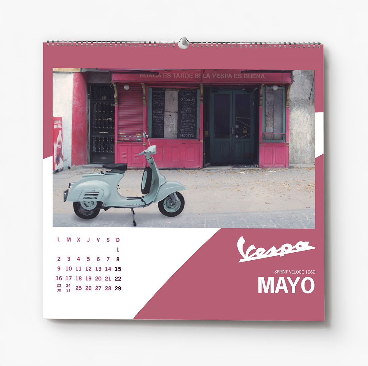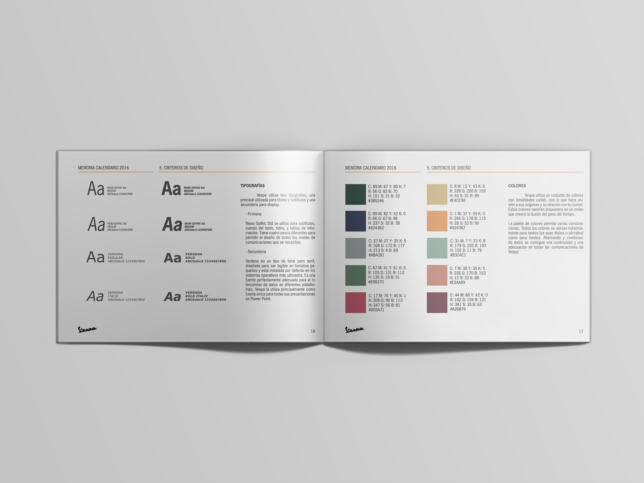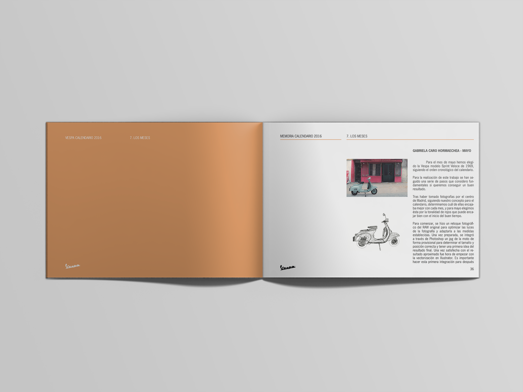 Once this step was finished, I designed the calendar following Vespa's identity guidelines. The final step was to design and write the memoir that comes with the calendar, which I also designed.